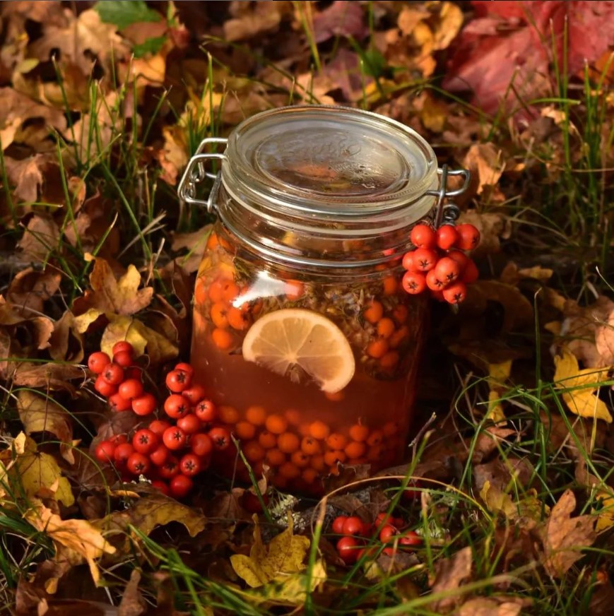 Jeřabiny jsem naložila s květy řebříčku, přidala citrón, pomerančovou kůru, koření a med.